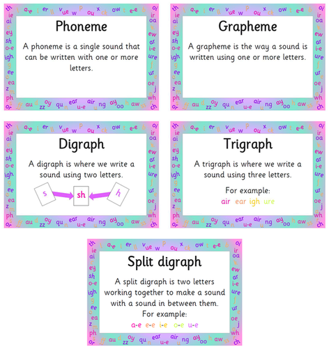 What do Phoneme, Grapheme, Digraph, Trigraph and Split Digraph mean?