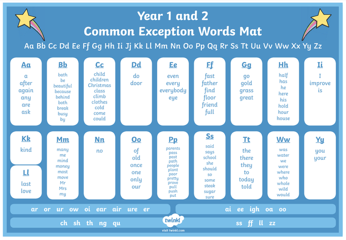 Some words are not straightforward to read using phonics but do appear frequently in the English language. These words are taught as 'tricky words' or 'common exception words' (exceptions to the rules of phonics). These are listed below for Year One and Two.